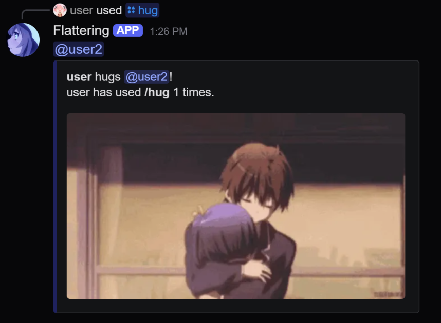 Flattering is a fun Discord bot lets you interact with your contacts in a more personal and expressive way. Once you install it on your server, you can use simple slash commands to send animated GIFs and descriptions that match your actions. This makes chats more lively and enjoyable.